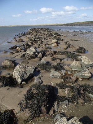 The classic shape for a fish trap is a simple V-shape, which would allow the tide flow to draw fish into the point of the V where they could be collected. The structure I have found does not conform to this – it is a simple straight stone bank. In many ways this is reminiscent of the stone feature known as the ‘Black Dyke’ that lies in Budle Bay, but other parallels can be found e.g. the stone fishtrap at Balleghan in Lough Swilley (Co. Donegal, Ireland) (Montgomery, Paul. (2015). Intertidal Fish Traps from Ireland: Some Recent Discoveries in Lough Swilly, Co. Donegal. Journal of Maritime Archaeology. 10. 117-139). The publication of the Balleeghan example suggests that this was originally a V-shaped trap with only one arm surviving which is a possibility in this case. The examples from Budle Bay show a mix of V-shaped traps and simple banks/barriers.