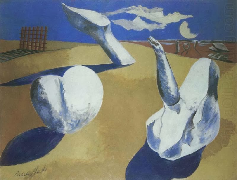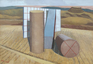 His visit and his photos went on to form the basis for a series of paintings based on Avebury – Druid Landscape, Landscape of the Megaliths , the Circle of Monoliths, Nocturnal Landscape and most abstractly Equivalents for the Megaliths. The interesting thing about these pictures is that they entirely ignore the built environment of Avebury, the village, the manor house and the church. Instead he strips back these accretions to present a purer vision of the stones. He is focussing on them almost entirely in terms of form rather than in terms of their human dimension. The only hint of human activity is in the presence of plough furrows that run up to (and under?) one of the monoliths in Landscape of the Megaliths.