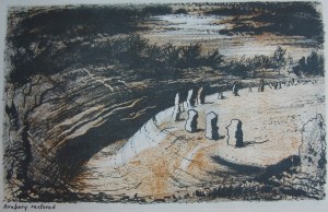 Nash was not the only painter of this period to paint Avebury. John Piper was also very interested in prehistory- indeed he had written a short spread in the art magazine Axis about aerial photography of prehistoric sites. In his paintings of Avebury, he too pushed away the village, although he didn’t entirely excise it like Nash did. In his painting Avebury Restored the tower of the church is just visible in the background. In another meditation on prehistoric Wiltshire he showed Avebury and the Avenue, but the modern world only appears in the form of the skylined obelisk that is the Landsdowne Monument on Cherhill Down. I’m intrigued how Piper and Nash both seem to push out the modern (or indeed anything not prehistoric) in their depictions of Avebury- they seem interested in the deep past, but not in its juxtaposition with later periods. This lack of juxtaposition is surprising as it is this placing of the past against the present that is often seen as one of the defining aspects of 1940s Neo-Romanticism- one thinks of Eric Ravilious’s images of chalk hill figures, seen from seen from trains or behind barbed wire. In fact Myfanwy Piper (wife of John) writes of Nash in 1937 “He has no interest in the past as past, but the accumulated intenseness of the past as present is his special concern and joy”. I would contend though that there is surprisingly little evidence of this present in Nash’s Avebury work. It also contrasts with the folk-horror/uncanny sensibility of Children of the Stones and Stigma which seems to explore the past within the present and is might perhaps be seen as a very 1970s reworking of Neo-Romanticism for a nuclear age.