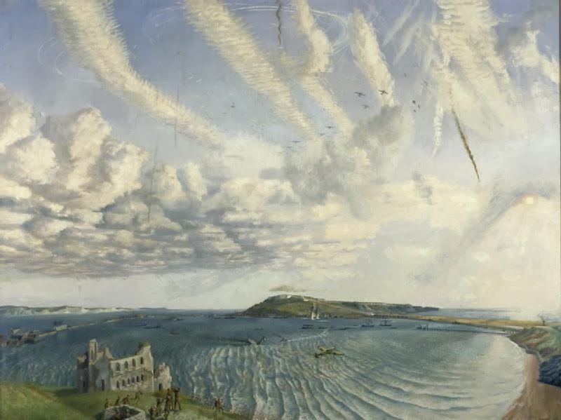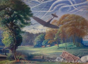 Vapour trails also appear in the work of other war artists, such as Richard Eurich, who depicted them on the south coast in his painting Fortresses over Southampton Water and Airfight Over Portland, and Walter Monnington’s Southern England, 1944. Spitfires Attacking Flying-Bombs.