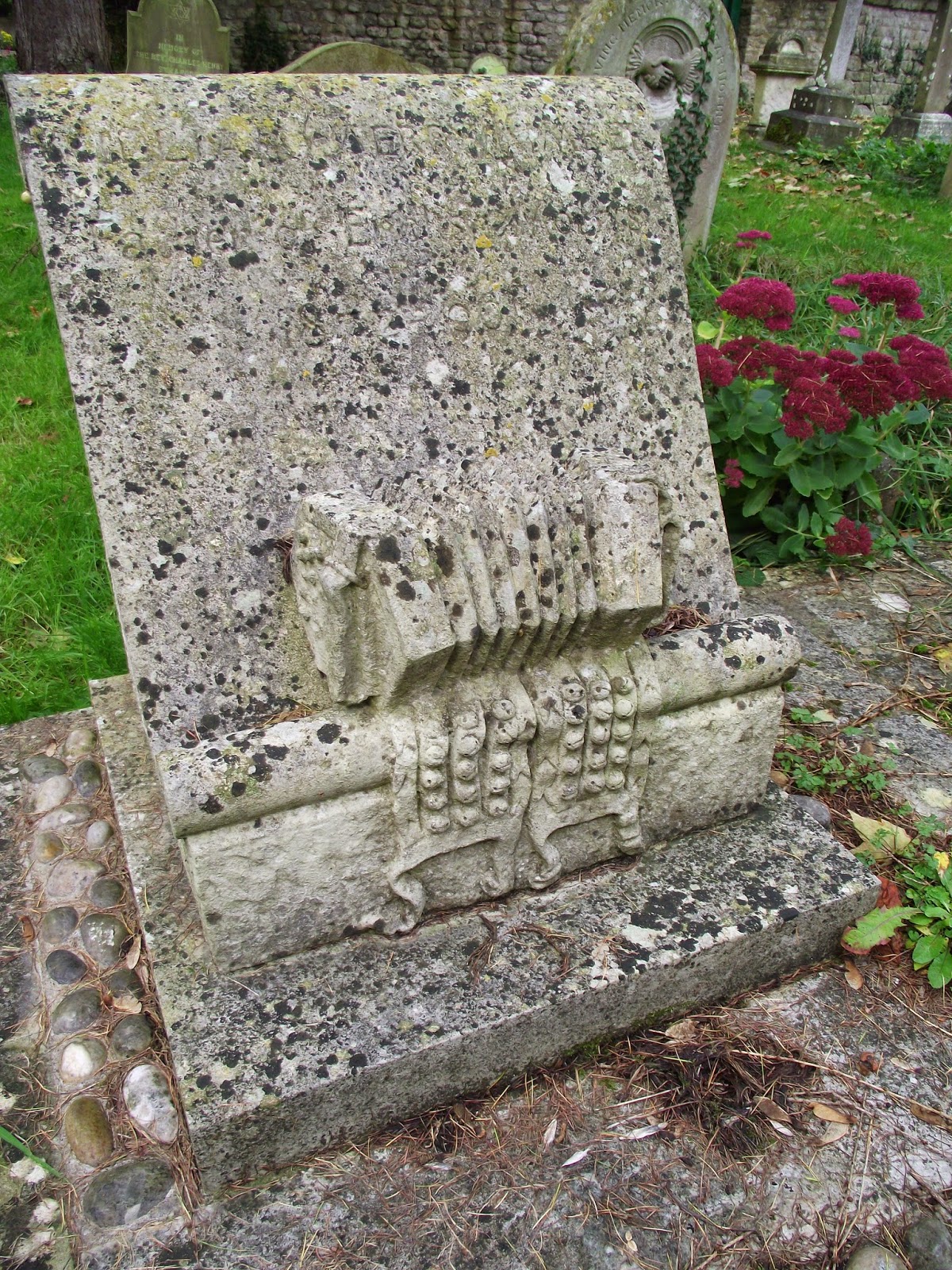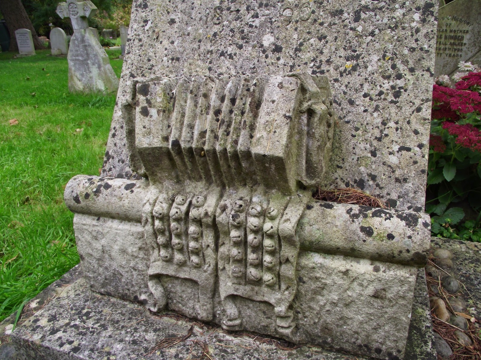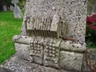 William Kimber died in 1961 and is buried in Holy Trinity churchyard, Headington Quarry, just round the corner from CS Lewis, another resident of Headington. Rather splendidly, his gravestone is decorated with carved stone morris bells and a concertina – the inscription reads “WILLIAM (MERRY) KIMBER / Father of English Morris1872–1961