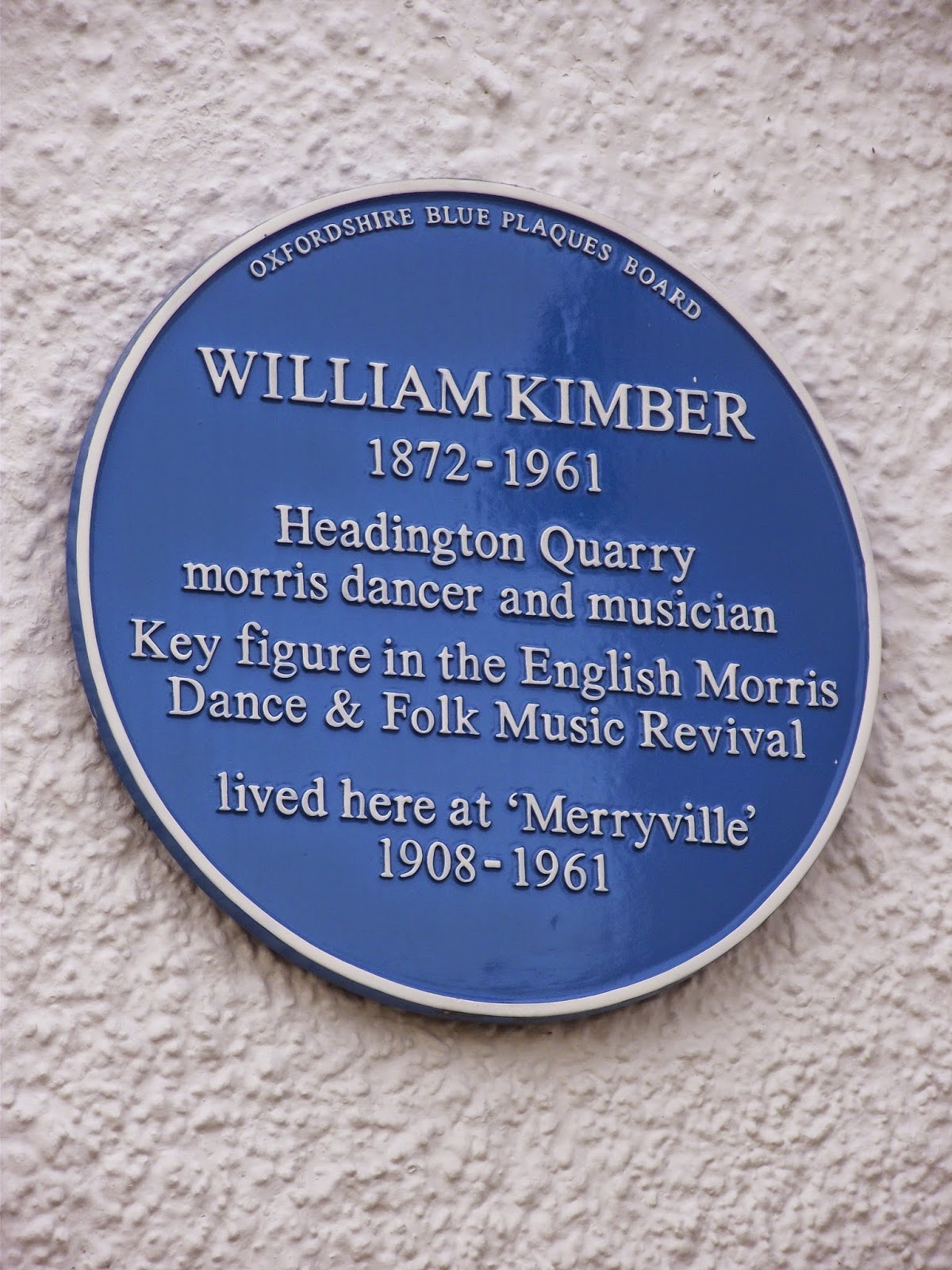 Kimber worked for most of his life as a builder. He built many houses in the area – and around 1908 he built his own house Merryville (after his nickname Merry) at 42 St Anne’s Road. In 2011, the Oxfordshire Blue Plaque scheme awarded it with a blue plaque reading “WILLIAM KIMBER / 1872–1961 / Headington Quarry morris dancer and musician / Key figure in the English Morris / Dance & Folk Music Revival / lived here at ‘Merryville’ / 1908–1961.