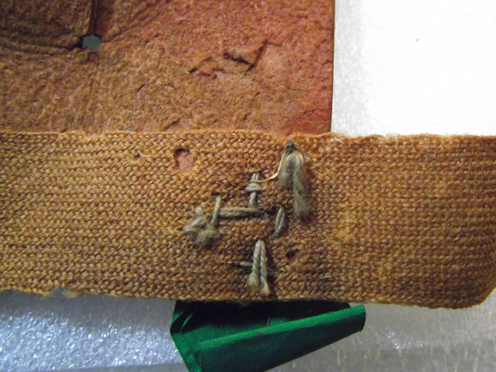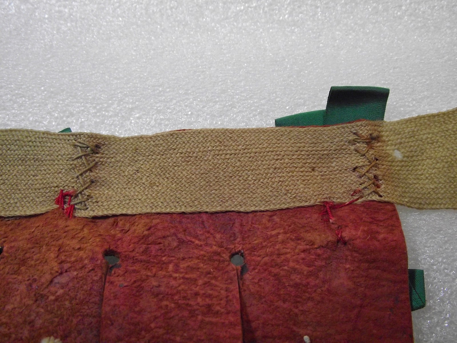 | Stitching attaching leg ribbon on 1945 bell set- gain, note use of red thread to attach the green ribbon |