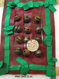 Intriguingly, the 1945 set appear different. There are clear broad similarities, the types of bell, the leather sheet onto which the bells are attached and the colour scheme are more or less identical. However, there are also noticeable differences. First, although the green ribbon is the same colour, it is distinctly narrower than that on the other pads. There are also subtle differences in the crotal bells. Those on the 1945 have a narrower slot in them than those on the other pads do – they clearly come from a different source.