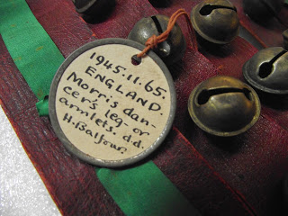 When the pad is turned over there are other differences. First, although the way in which the bells are held onto the pad is similar in that a string is run through the loop shanks of all four bells on each strip of leather, there are some subtle distinctions, most notably there is more string left over after the knot is tied at the top and bottom. Similar differences in construction can be seen when comparing the way in which the ribbon that ties the pad to the leg are compared. On the 1945 pad the ribbon is attached neatly by vertical groups of cross-stitches (I may have the technical term incorrect). On the others, the ribbon is attached by a less systematic cluster of simple stitches (again, I don’t have the technical terminology). A final difference can be seen in the way in which the green ribbon is attached to the leather backing. In the 1945 set, a red thread is used – this is distinct from the buff thread used to attach the ribbon on the same pad. In the other sets, the same buff thread is used to attach both the leg ribbons and the green ribbons.