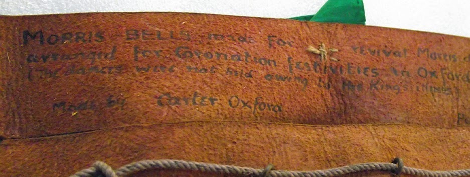 This description holds true of the other bell pads in this group. These were collected at intervals and were accessioned in 1903, 1917, 1945 and 2008. The all appear very similar; the earliest set (1903.57.1) have written on them “’Morris bell sets, made for the revival of Morris dances arranged for the Coronation festivities in Oxford 1902 (the dances were not held owning to the King’s illness)”. Their similarity suggests that although collected at times they were intended as a set all for use in the 1902 festivities.