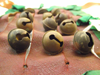 Four pairs of bell pads made of red leather with green ribbon around the perimeter, gathered into small bows at the corners and midpoints of each side, and with light brown braid for leg ties. Each has twelve crotal bells arranged 4×3 on the three central vertical strips of leather. 200 x 149 mm
